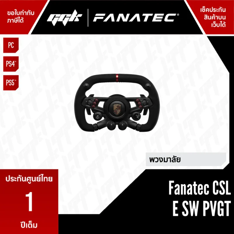 Fanatec CSL E SW PVGT เป็นพวงมาลัยที่ระบุว่าเป็น ลิขสิทธิ์แท้ของ Porsche Vision Gran Turismo concept car ออกแบบสไตล์อนาคต (futuristic design) มีช่องตัดก้านพวงมาลัยที่เป็นเอกลักษณ์ (unique spoke cutouts) และถูกระบุว่า optimized for sim racing