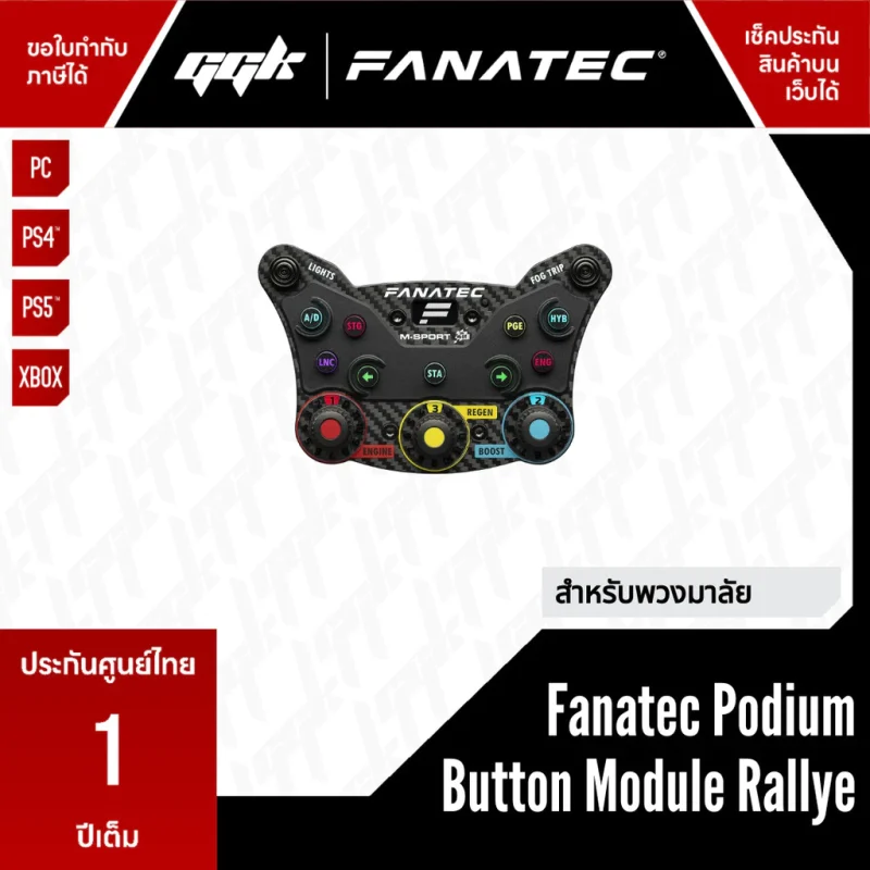 Fanatec Podium Button Module Rallye เป็นโมดูลปุ่มสำหรับซิมเรซซิ่งแนวแรลลี่ที่ระบุว่าเป็น สินค้า Official ของ M-Sport World Rally Team และถูกออกแบบตามรถแข่ง 2022 และ 2023 Ford Puma Hybrid Rally1 WRC ตัวบอดี้ถูกระบุว่า กะทัดรัด น้ำหนักเบา ทนทาน และ “ergonomically optimised” เพื่อการใช้งานระหว่างช่วงทางแรลลี่ รวมถึงผ่านการทดสอบในสภาพอุณหภูมิและเงื่อนไขที่หนัก